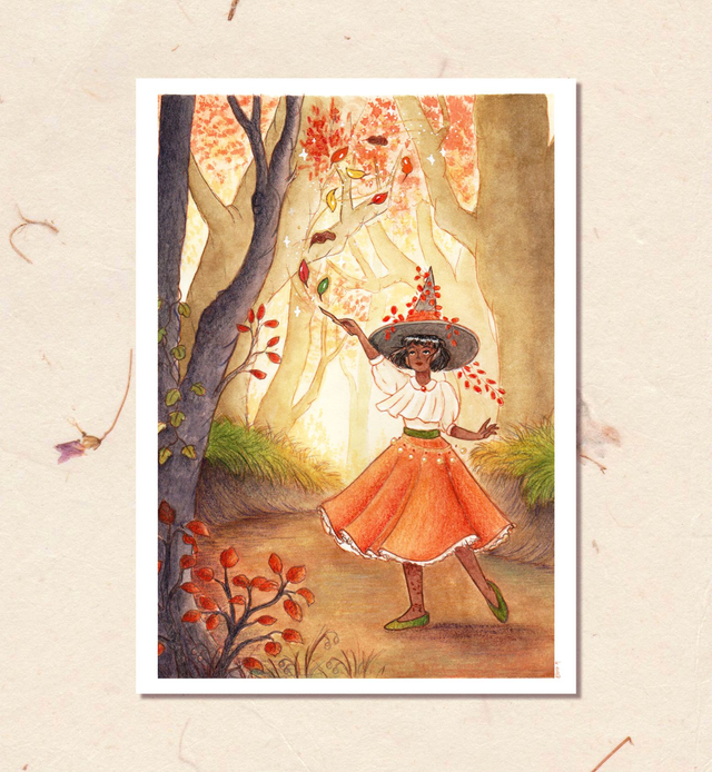 - Format A5 (15x21 cm) sur du beau papier texturé rappelant le papier aquarelle, en 300gr (ATTENTION : ce format est recto/verso avec la "Sorcière" au verso (voir photo).